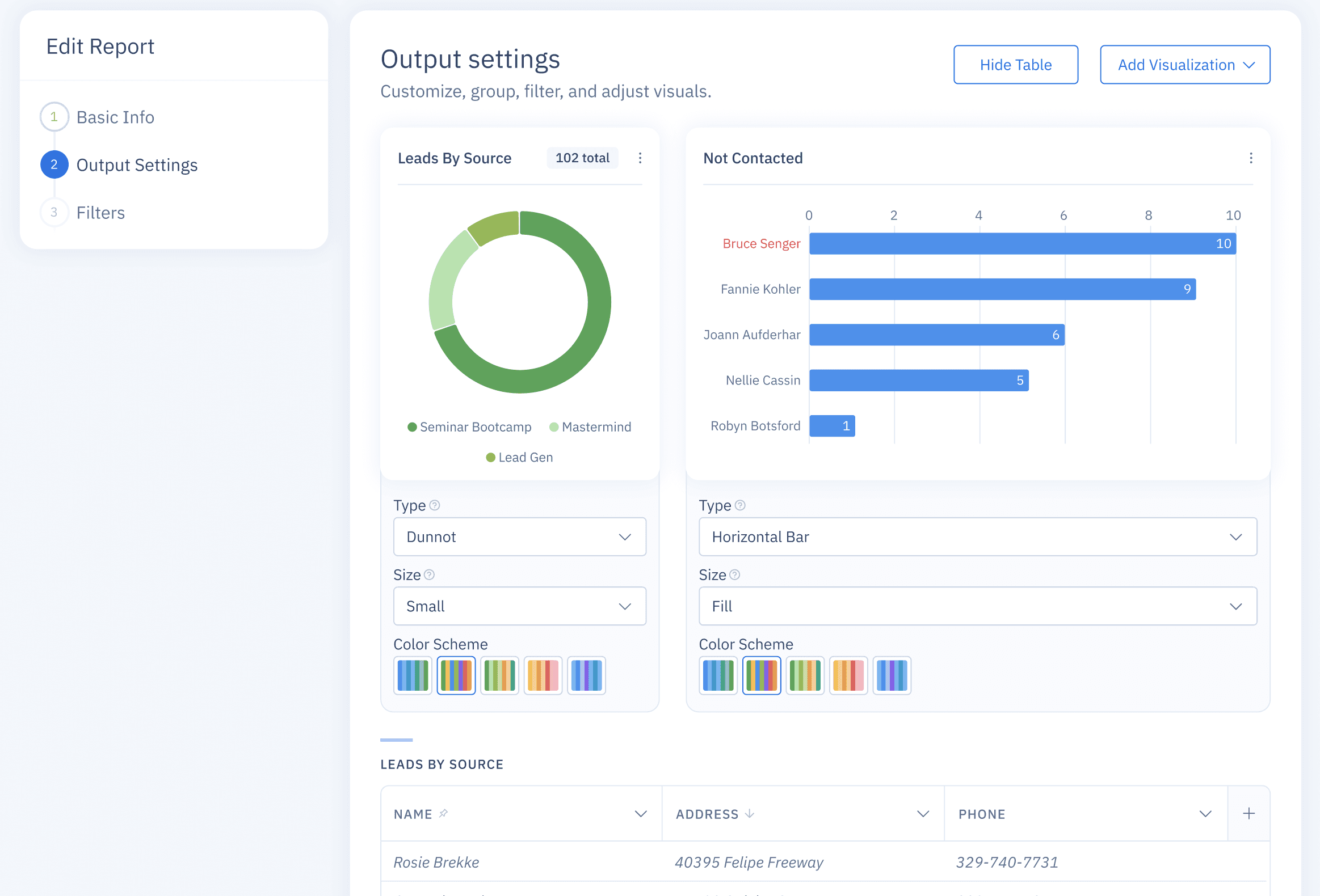 Make charts editable in-place: change type, size, color scheme, and grouping without leaving context. Add or remove visualizations with one click.